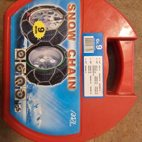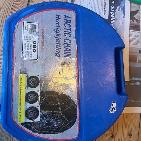 Duratool sne- og lumikæder til dæk, designet til at forbedre vejgreb under sne- og isforhold. Kæderne leveres i en opbevaringskasse med håndtag og inkluderer monteringsvejledning. Materialet består af metal og gummi, tilpasset forskellige dækstørrelser som angivet på emballagen.