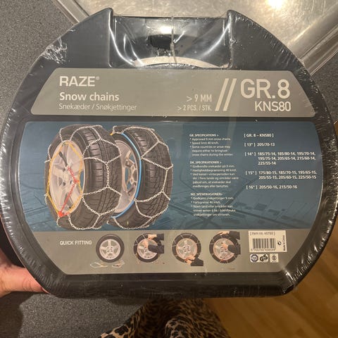 TXR9 sneketting med 9 mm tykkelse, designet til brug på dæk i størrelserne 195/60-16, 215/60-16, 225/55-16, 235/55-16, 245/45-17, 215/60-18, 205/55-19 og 195/55-20. Snekettingen er beregnet til at forbedre vejgreb under vinterforhold.