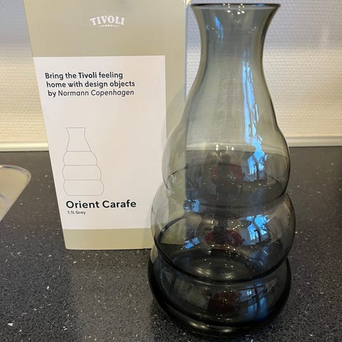 "The Orient carafe and glass are made of hand-blown colored glass. With a reference to Tivoli’s many oriental details in architecture, materials and colors, the curved design has a familiar and friendly expression.