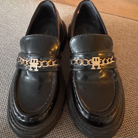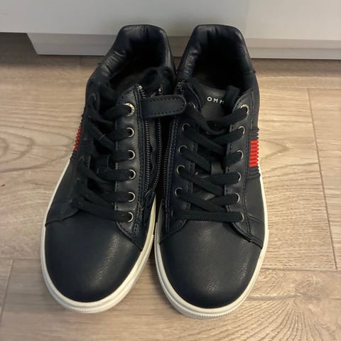 Tommy Hilfiger børnesko til unisex, størrelse 38. Skoene har en sort og rosa farvekombination og er designet til børn. Materialet og yderligere specifikationer er ikke angivet. De har været brugt 2 gange