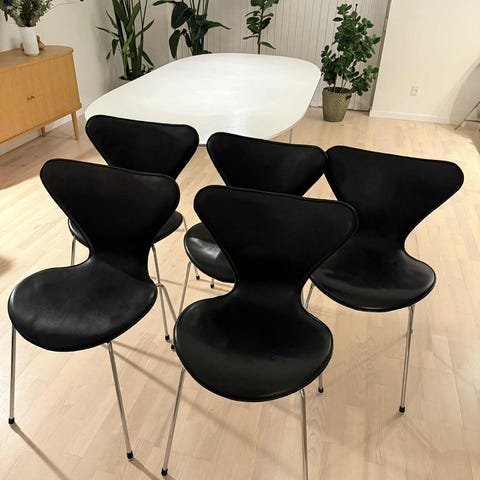 Flotte 7’er stole i hvid, betrukket med sort læder. Krom ben