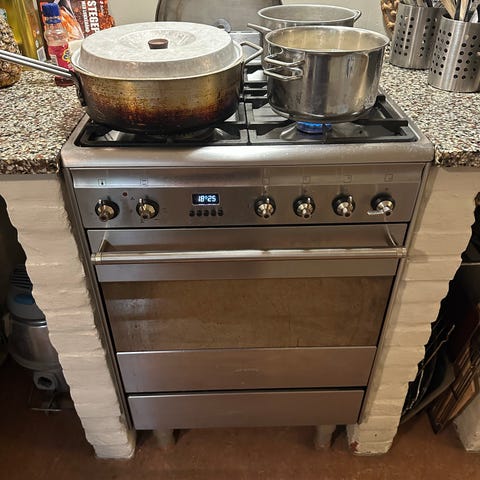 Smeg gaskomfur i rustfrit stål med 5 brændere. 90 cm bredt. 15 år gammelt. Ovnpæren er defekt.