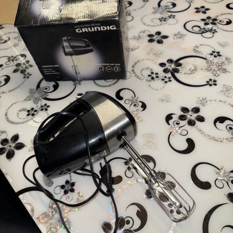 Biltema håndmixer i hvid farve med tilbehør til piskning og æltning. Elektrisk køkkenredskab til blanding af ingredienser ved madlavning og bagning.
