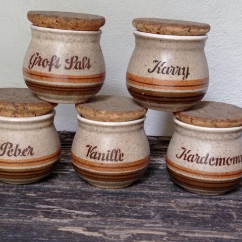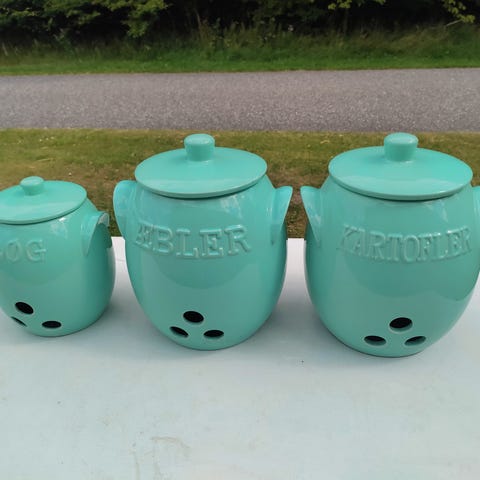 Opbevaringskrukker til kartofler h25/b22, løg h20/b17, hvidløg h15/b12. Super stand.