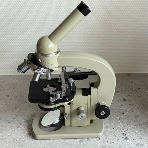 Solidt klassisk Reichert laboratoriemikroskop produceret i Østrig – kendt for høj mekanisk og optisk kvalitet. Instrumentet fremstår komplet, funktionelt og mekanisk intakt med original kasse, præcisionsjusteringer, objektivrevolver og justerbart præparatbord.