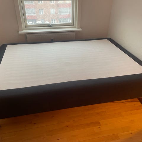 Sælger denne seng - klassisk boxmadras - med lyse egetræsben. Sengen sælges uden dyner/puder og uden topmadras.