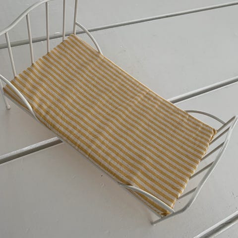Maileg børneseng med metalramme og madras med mønstret betræk. Sengen er designet til dukker og legetøj.til MY kaniner