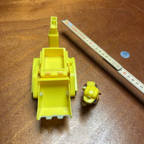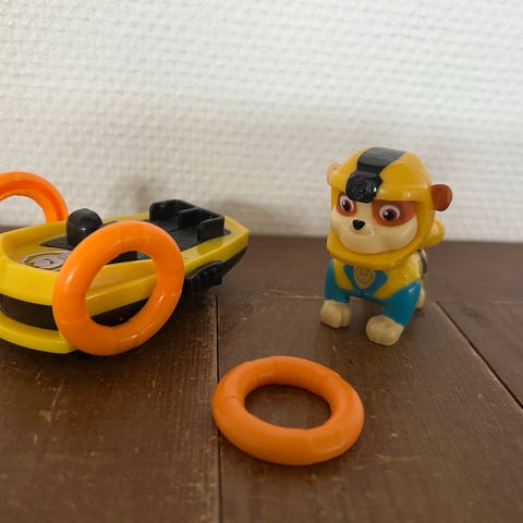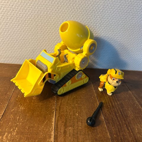 Paw Patrol Rubble bulldozer legetøj i gul farve. Inkluderer en figur af Rubble. Der er 2 "patroner" til at sætte i foran så den kan skyde. Skyder meget stille og roligt.