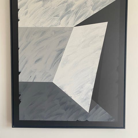 Maleri af den århusianske kunstner Paul Bruun, fast tilknyttet kunstner hos Midtjyllands Kunstcenter i Bryrup, købspris ( kan dok. ) i 2015 kr. 9.000. Maleriet måler 85x65 cm og er indrammet i sort svæveramme med sølvkant.
