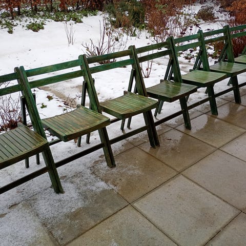 8 flotte lyse, hvide klapstole.