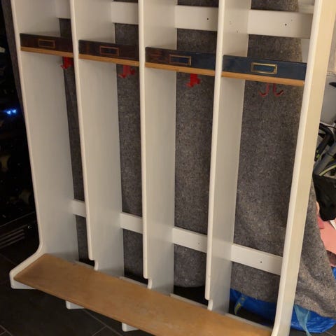 Velholdt børnegarderobe med plads til 3. Passet godt på, med brugsspor på tremmerne til sko osv.