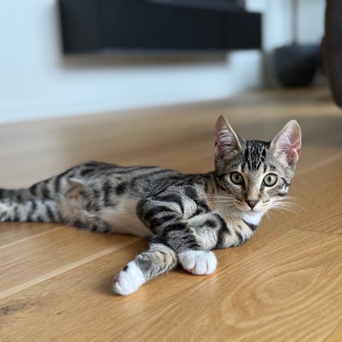 Charlie er en kastreret hankat på 3, snart 4 år (09-02-2022). Han fik amputeret halen efter en skade da han var killing, men han klarer sig helt fint med stumpen. Fin balance og selvsikker. Han kravler og hopper også fint på (katte)møbler og er nysgerrig. Legesyg og energisk, meget social anlagt, kan godt lide at være ‘i nærheden’/‘i baggrunden’. Han har meget søde kælne øjeblikke, men mere social/legesyg. Han er vokal, ligesom bengal katteracen er normalt. Han synes vand er spændende og klarer nemt et potebad, hvis han har været på muddertur.