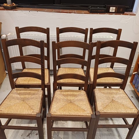 Stolene er fra december 2021 og kostede dengang 600 kr. pr. stol, men er ikke alle i lige god stand (derfor den store rabat). To af stolene er lidt mere slidte i ryggen, men de fire andre er stadig udmærkede.