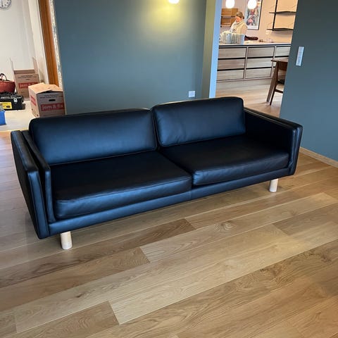 Den 3 personers lædersofa er en klassiker designet af Erik Jørgensen. Den er fra 2011 og ombetrukket med sort kvalitets læder i 2022 af Up Nordic. Nypris ca. 65.000,-