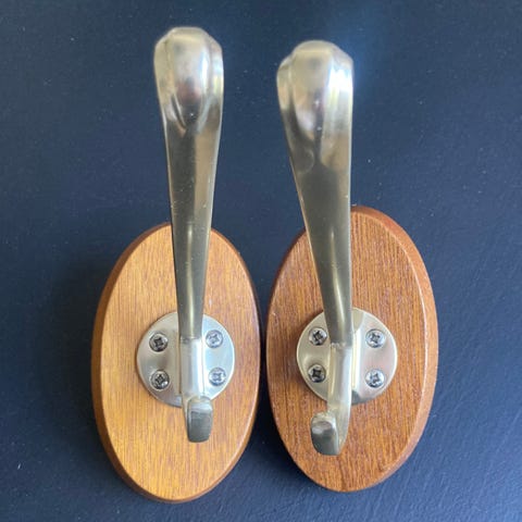 6 stk knager i massivt metal med blank messing finish, er i tvivl om hvilket metal de er lavet af, men det virker lettere end messing, så muligvis en legering af en slags.