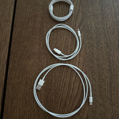 Originale Apple Lightning-kabler, som fulgte med iPad. Ligger i den oprindelige indpakning, og er aldrig taget i brug eller ud af indpakningen. Kompatibel med iPhones og iPads med Lightning-stik.