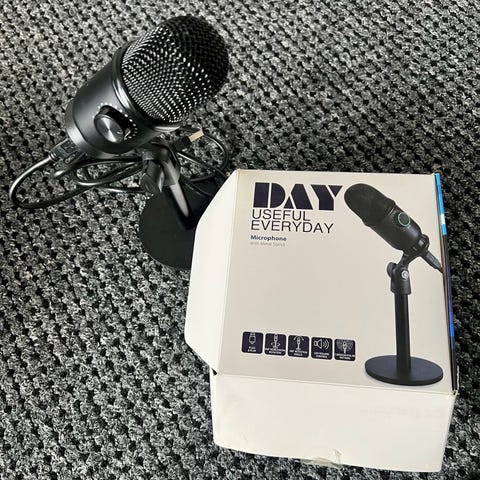 Don One trådløse mikrofoner med USB-oplader. Sættet indeholder to mikrofoner, en med rød markering og en med blå markering. Mikrofonerne oplades via USB-kabel medfølgende brugervejledning.