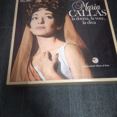 Maria Callas Gui Dei Della Musica vinylpladesamling med operaoptagelser. Indeholder flere plader med billeder af Maria Callas i forskellige kostumer fra operaer som La Traviata, Norma og Il Trovatore. Pladerne har tekst på italiensk og viser klassiske operaopførelser.