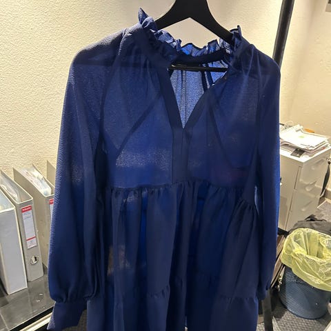 Stine Goya kjole til særlige lejligheder i størrelse S. Kjolen er blå og lavet af polyester. Designet henvender sig til kvinder og er egnet til brug ved særlige lejligheder.
