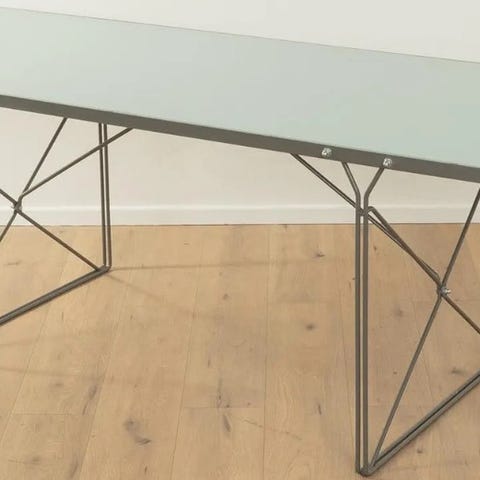 Bordplade er klart glas og stellet er består af 2 stk elipse formet børstet stål konsoller