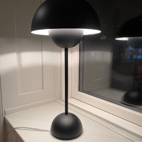 Grå &Tradition Verner Panton bordlampe designet af Verner Panton. Lampen har en rund skærm og en slank fod, egnet til brug som bordlampe i forskellige rum.