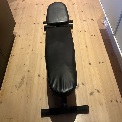 Powerhouse bænk - Bundsolid men selve pudestoffet er gået noget op. Har repareret det med gaffa. Den fungerer fint, både til skråpres og liggende.