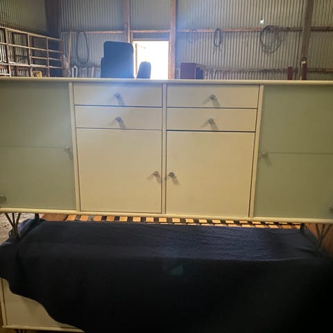 Der er spotpære indvendigt i loftet af skabet, som skal monteres med ledning. Der er stål ben på