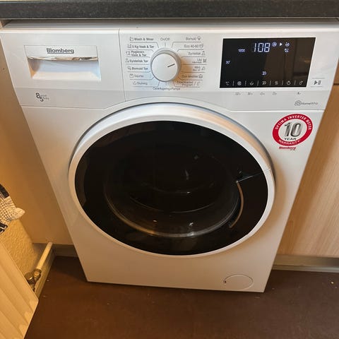 Blomberg kombineret vask/tørring. Vaskemaskine med integreret tørrefunktion, hvid farve, frontbetjent med stor tromle til vask og tørring af tøj.