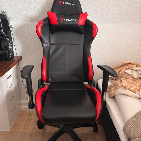 Paracon Gaming Stol i sort og rød farve med justerbare armlæn og hjul til nem bevægelse. Designet til brug ved skrivebord, egnet til gaming eller kontorarbejde.