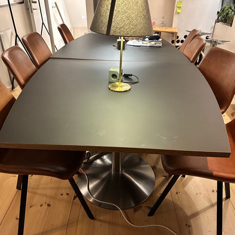 Delta konferencebord i tøndeform med top plade i hvid Nono laminat med poleret aluminiums stel.