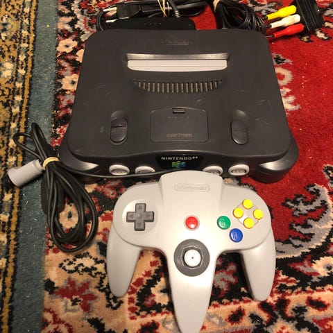 Nintendo 64 spillekonsol med tilhørende tre controllere i farverne gul, rød og grå.