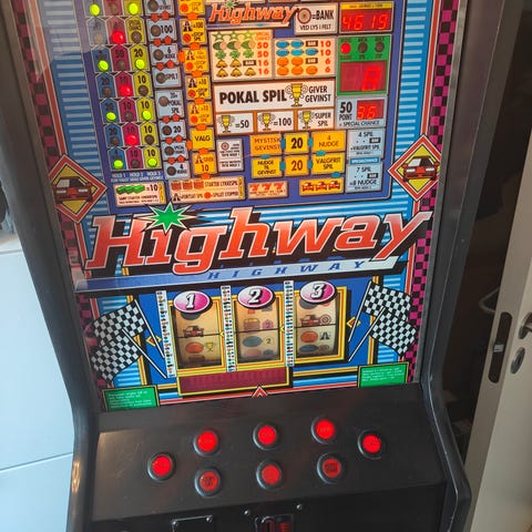 Highway spilleautomat med flere røde knapper til betjening. Spilleautomaten har et farverigt display med forskellige symboler og tekst, der indikerer spillets funktioner og muligheder.