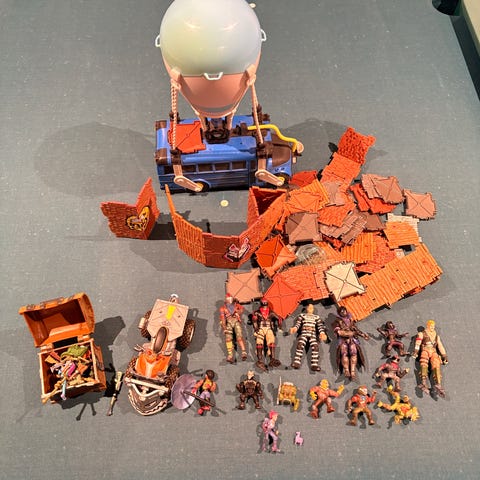 Fortnite actionfigur med tilbehør, herunder forskellige våben i flere farver og designs. Figuren og tilbehøret kan bruges til samling eller leg.