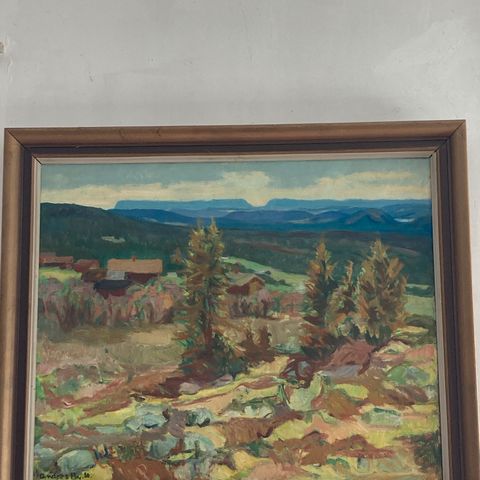 Merete Foxmar maleri med motiv af et vinterlandskab med sneklædte bjerge og træer. Maleriet er udført på lærred og indrammet. 40x30 cm