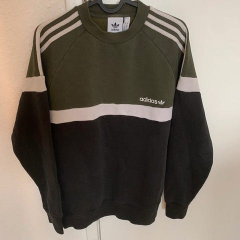 Adidas sweatshirt i størrelse L. Fremstillet af bomuld og har en grøn farve. Sweatshirten har ribkanter ved ærmer og bund, samt broderet Adidas logo på fronten.
