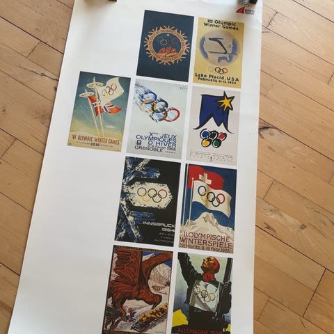 Olympia plakat med illustration af en dansende pige i farverne rød, blå, hvid og gul. Plakaten har brugsspor og mindre skader i kanterne. Materialet er papir, og plakaten har et vintage udseende.