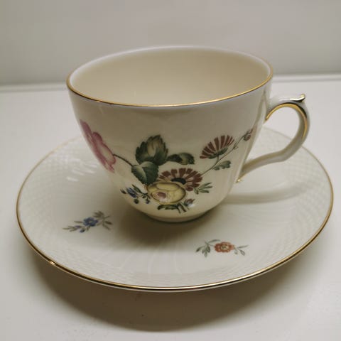 Mangefarvede rokoko-blomsterdekorationer og guldkant.