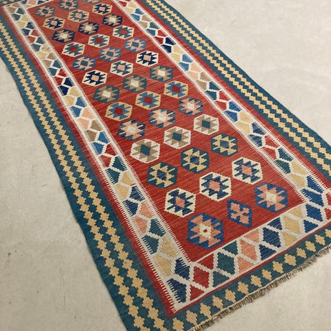 Stort og smukt håndvævet / håndknyttet kelim tæppe i uld. Perfekt til stuen eller under spisebordet. Har også andre kelim tæpper og kelim puder til salg. SENDER GERNE MOD BETALING. Vævningen er gået lidt op ved kanten i den ene ende men tænker det kan fikses.