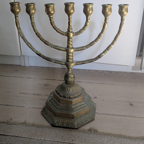 Sælger en 7-armet lysestage (menorah) i massiv messing/messinglegering med tung, dekorativ fod. Flot patina og står rigtig pænt som pynt eller til brug.