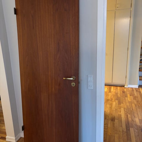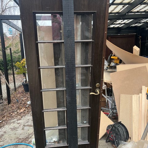 Smuk indendørs teaktræsdør fra 60’erne. Den har et fint matteret glas og et smukt messing håndtag. Kan afhentes i Virum.