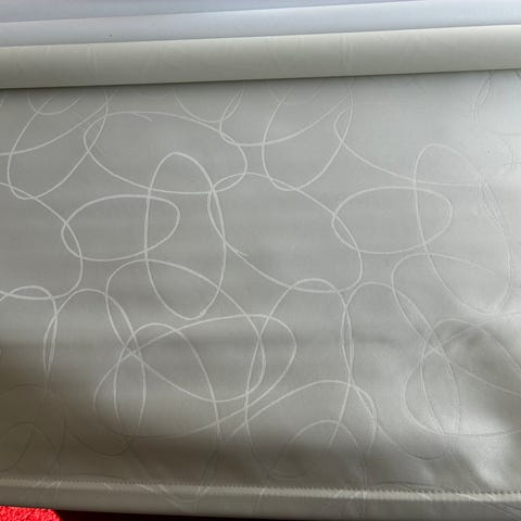 Hvidt med fint blomstermønster (ikke mørklægnings). Kædetræk i venstre side, når du kigger på rullegardinet.