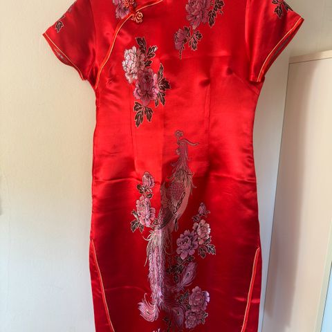 Smuk og virkelig elegant vintage kjole i rosa / varm pink med kinakrave og asymmetrisk knaplukning i siden (qipao/cheongsam-inspireret snit).