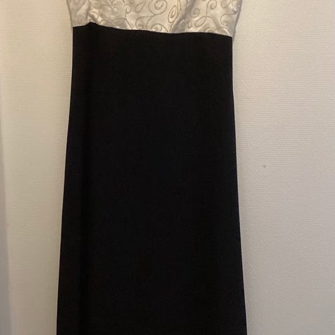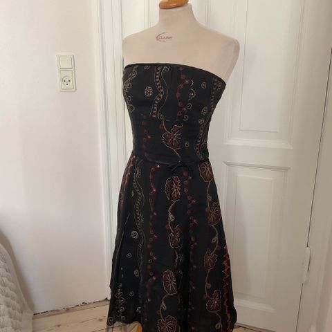 Kjolen har et diskret strukturmønster i stoffet og et flot blomstermønster/broderi nederst, som giver ekstra detaljer og dybde.