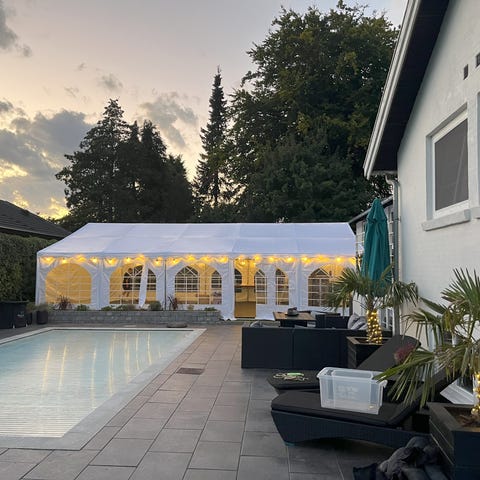 Sælger dette utrolig solide og fleksible festtelt på i alt 72 m². Det er den perfekte løsning til store havefester, bryllupper eller firmaarrangementer, hvor man ønsker både kvalitet og komfort.