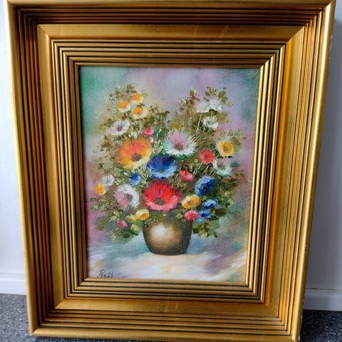 Blomsterne er elegant arrangeret i en dekorativ skål, udført med sans for både dybde, lys og bevægelse. Penselføringen er levende og detaljerig, særligt i bladpartierne og blomstens sarte kronblade, som fremstår naturlige og harmoniske.
