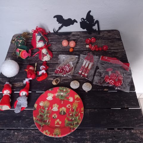 En samling af forskelligt julepynt. Her er figurer som julemænd, nisser og snemænd. Materialerne er blandt andet stof og garn.