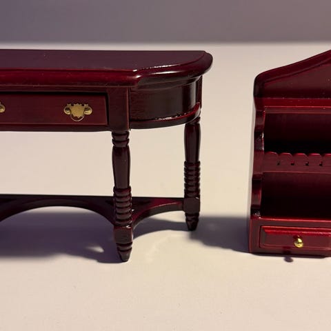 To miniaturetræmøbler i rødbrunt træ. Det ene er et vitrineskab med glaslåge og hylder. Det andet er en reol med to åbne hylder og et underskab med tre låger. Begge møbler har detaljerede udskæringer.