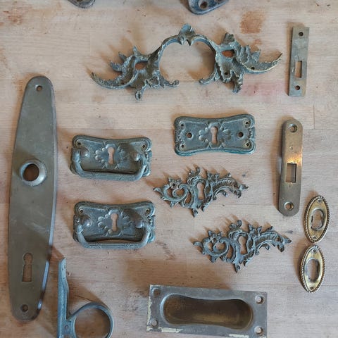 Gamle/antikke møbelbeslag, nøgleskilte, nøglehulsbeslag, messing møbelknopper og porcelænsknopper. Se udvalget på billederne, målene og priserne.
