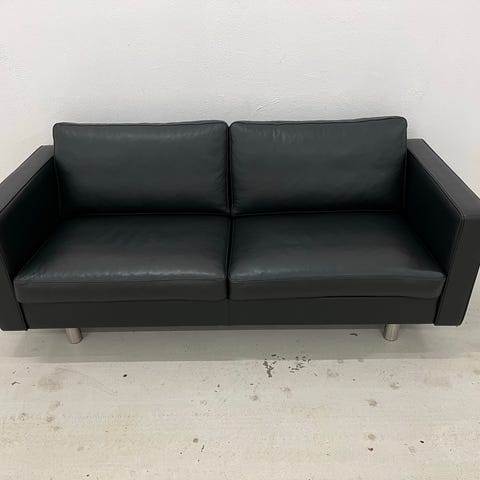 Eksklusiv 2,5-personers sofa, model MH321, designet af Mogens Hansen. Sofaen er udført i sort Loke-læder og monteret med runde ben i børstet stål. Møblet fremstår i særdeles flot stand og står som ny. Sofaen har stået i et røg-, dyre- og børnefrit hjem.