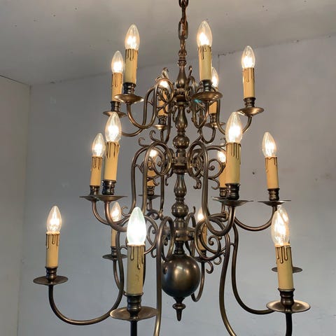 Gammel lysekrone med 16 arme. Købt for 15.000 kr. for 25 år siden. Har ikke været brugt i mange år så den trænger til en rengøring og til at blive pudset. På kuglen ses hvordan den ser ud efter en omgang pudsning. H:74 x Ø:70 cm.